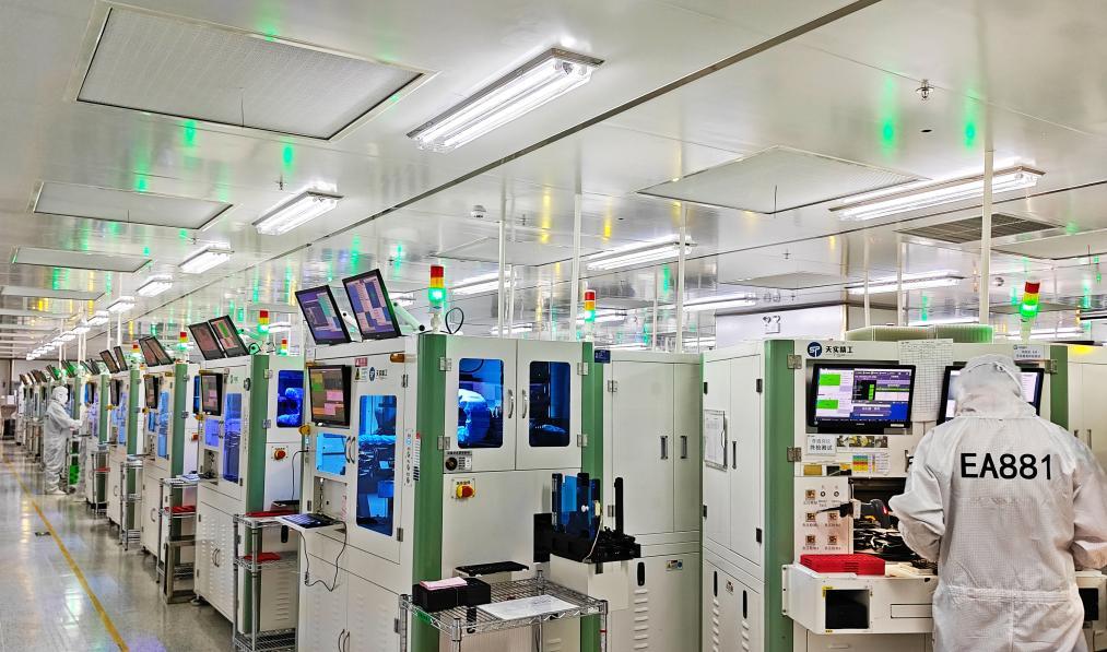 4月3日在重慶市天實(shí)精工科技有限公司無塵車間拍攝的攝像頭模組自動(dòng)化生產(chǎn)作業(yè)現(xiàn)場。新華社發(fā)(田浩良攝)