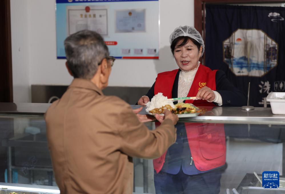 4月11日,馬鳳俠在??瞪鐓^(qū)“陽光食堂”給老人打飯。