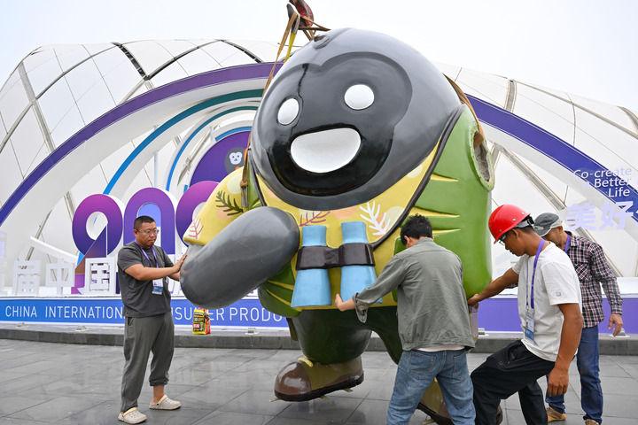 4月10日,工作人員在擺放消博會(huì)吉祥物。 新華社記者 郭程 攝