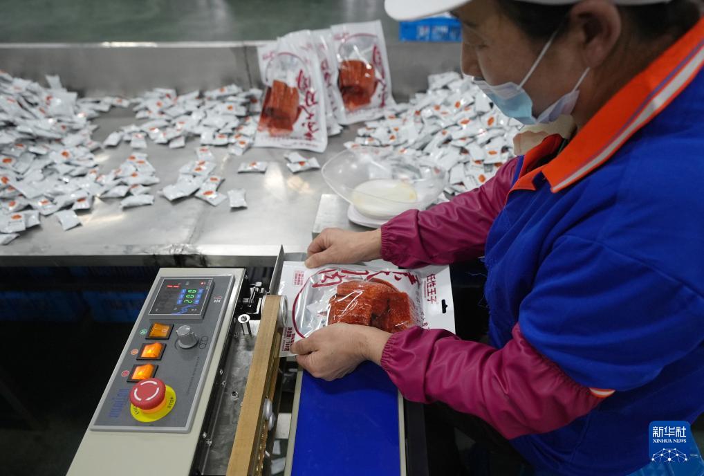4月11日,工作人員在沈陽市陽陽食品有限公司封裝辣條。
