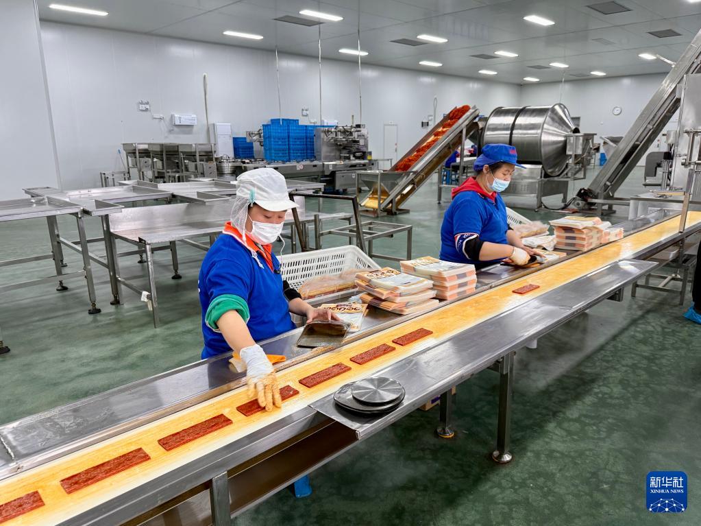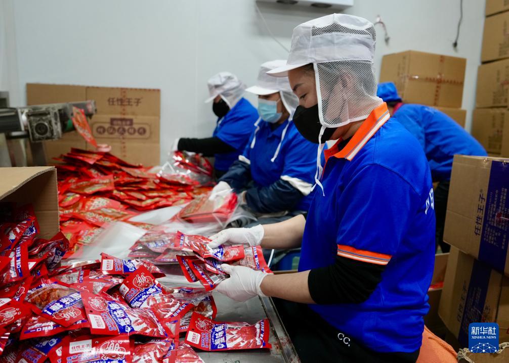 4月8日,在沈陽市陽陽食品有限公司,工人將辣條裝袋。