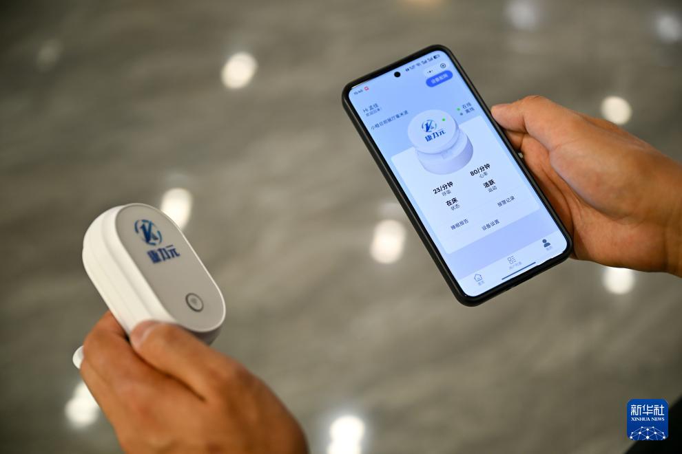 在天津小橙集團(tuán)有限公司,工作人員展示一款聯(lián)網(wǎng)可查看的毫米波體征監(jiān)測儀(4月18日攝)。