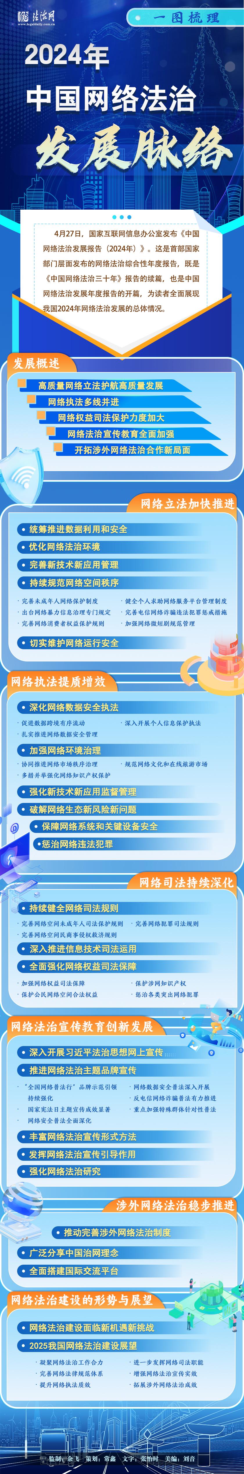 4月27日,國家互聯(lián)網(wǎng)信息辦公室發(fā)布《中國網(wǎng)絡(luò)法治發(fā)展報(bào)告(2024年)》。這是首部國家部門層面發(fā)布的網(wǎng)絡(luò)法治綜合性年度報(bào)告,既是《中國網(wǎng)絡(luò)法治三十年》報(bào)告的續(xù)篇,也是中國網(wǎng)絡(luò)法治發(fā)展年度報(bào)告的開篇,為讀者全面展現(xiàn)我國2024年網(wǎng)絡(luò)法治發(fā)展的總體情況。