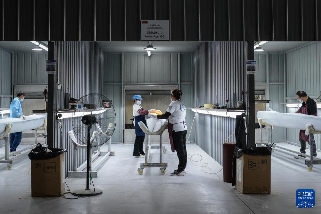 4月24日,在速力復合材料有限公司的生產(chǎn)車間內(nèi),工人在裝配海洋船。2024年,速力復材成為巴黎奧運會新增的風帆水翼賽事唯一指定生產(chǎn)商。