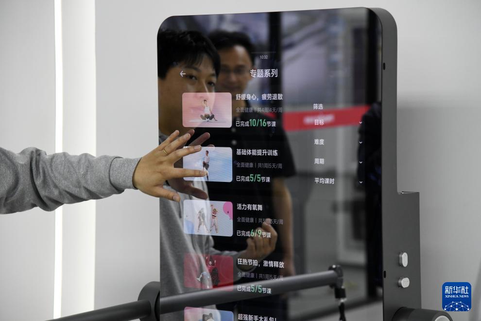 4月22日,工作人員在介紹英派斯智能健身鏡的視頻課程。