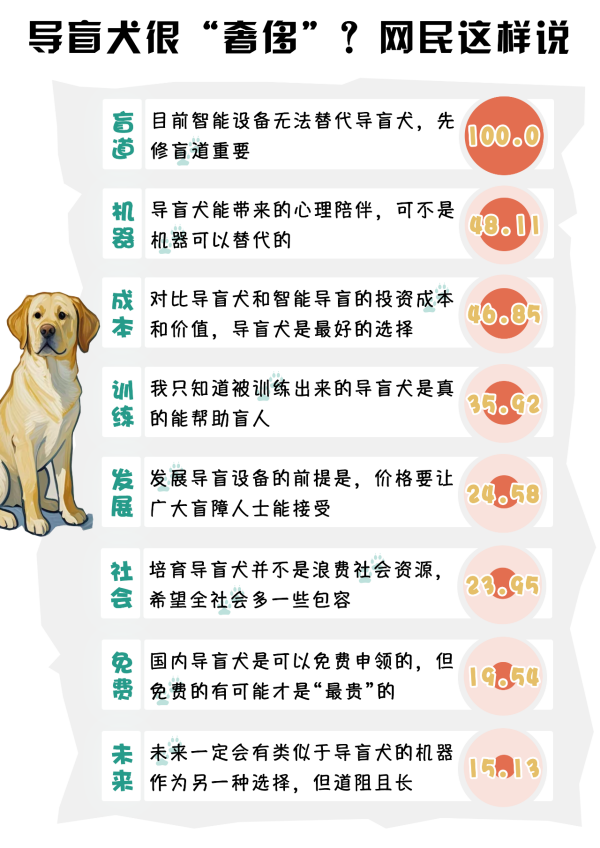 數(shù)據(jù)顯示,培訓(xùn)一條導(dǎo)盲犬的成本約20萬元,有人戲稱其是“奢侈品”。其實(shí),導(dǎo)盲犬是免費(fèi)給視障人士使用的,其養(yǎng)護(hù)、醫(yī)療等成本與寵物犬相差并不大。輿論場中,網(wǎng)民對(duì)于導(dǎo)盲犬的價(jià)值討論呈現(xiàn)截然不同看法。