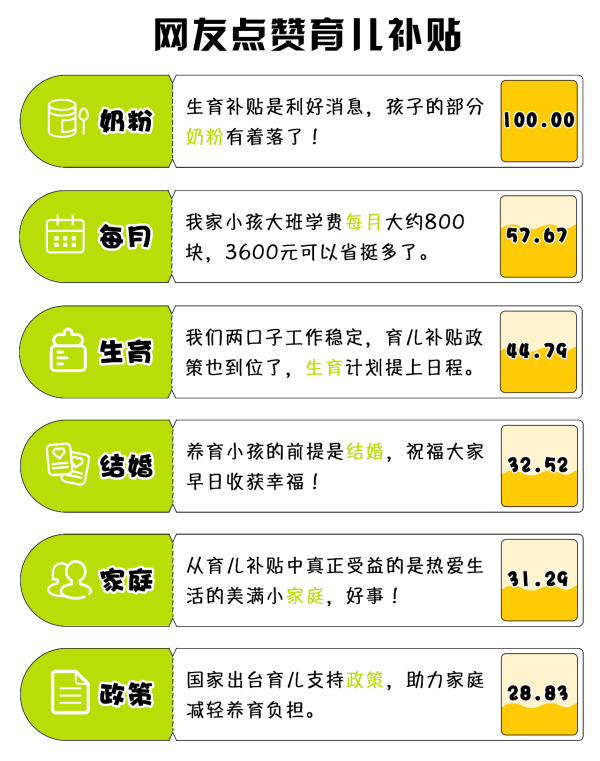 對相關(guān)輿論進行分析發(fā)現(xiàn),有網(wǎng)民認(rèn)為,國家出臺育兒補貼相關(guān)政策,在一定程度上幫助了有娃家庭減輕養(yǎng)育負(fù)擔(dān)。有網(wǎng)民從實際生活出發(fā),表示3600元可以幫助其解決日常養(yǎng)娃部分開銷,例如孩子上幼兒園的部分費用、奶粉錢等。未婚未育或者已婚未育的群體也表示,國家出臺的政策和福利定會對生育起到正向推動作用。對于年輕人來說,找到一份穩(wěn)定的工作、開啟一段幸福的婚姻、享受國家的福利政策保障,正是他們所期許的。