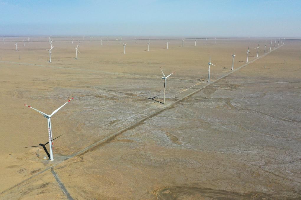 這是在新疆巴音郭楞蒙古自治州若羌縣拍攝的新天綠色能源股份有限公司新天若羌縣羅布莊10萬千瓦風(fēng)電項目(6月27日攝,無人機照片)。新華社記者 丁磊 攝