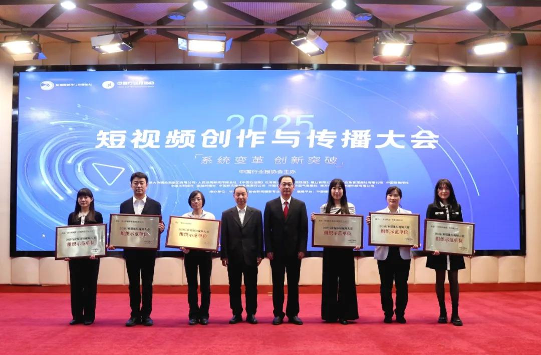 中國水利報(bào)社社長李國?。ㄓ宜模?,中國新聞出版廣電報(bào)總編輯丁以繡(左四)向2025行業(yè)媒體短視頻大賽二等獎(jiǎng)獲獎(jiǎng)代表頒發(fā)證書。董芳忠/攝