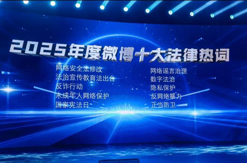活動現(xiàn)場還發(fā)布了“2025年度微博十大法律熱詞”,分別是:網(wǎng)絡(luò)安全法修改、網(wǎng)絡(luò)謠言治理、法治宣傳教育法出臺、數(shù)字法治、反詐行動、隱私保護、未成年人網(wǎng)絡(luò)保護、反網(wǎng)絡(luò)暴力、國家憲法日、正當(dāng)防衛(wèi)。