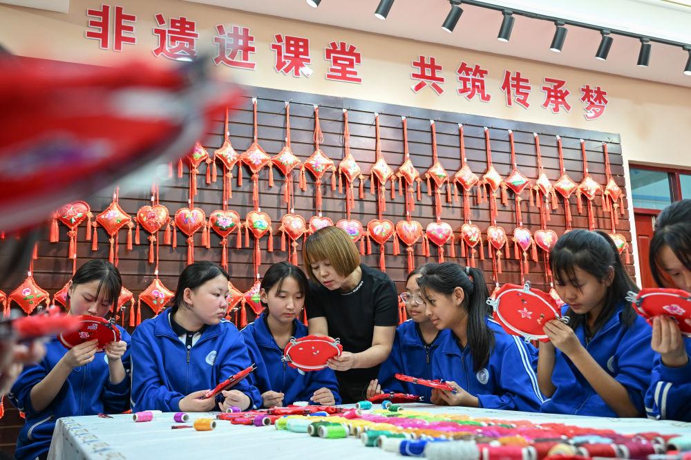 2025年9月26日,內(nèi)蒙古興安盟科右中旗巴彥呼舒第六中學(xué)美術(shù)教師、非遺傳承人吳斯琴(左四)指導(dǎo)學(xué)生刺繡。近年來,學(xué)校將當?shù)貒壹壏沁z圖什業(yè)圖刺繡引入校園,開設(shè)課程,并成立興趣社團,讓學(xué)生們近距離感受非遺的魅力,弘揚和傳承傳統(tǒng)文化。