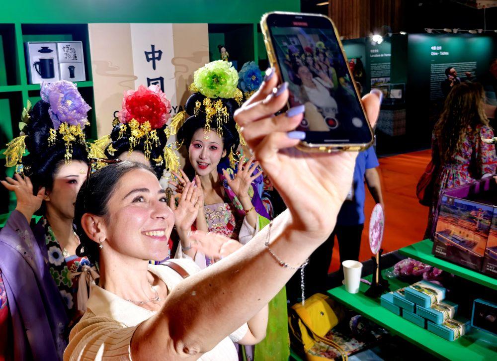 2025年4月30日,以“中國風(fēng)·中國潮”為主題的“遇鑒中國”2025中華文化主題展亮相當天開幕的法國巴黎博覽會。這是參觀者與唐代仕女妝造的中方參展人員在巴黎博覽會上合影。
