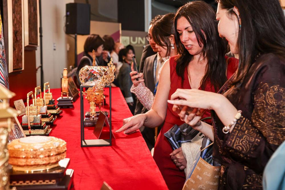 2025年5月19日,“生生不息——故宮文創(chuàng)走進聯(lián)合國主題展”開幕式暨故宮博物院成立100周年郵票發(fā)布儀式在聯(lián)合國總部舉行,120余位各國駐聯(lián)合國大使及國際組織代表參加。這是人們在參觀展覽。