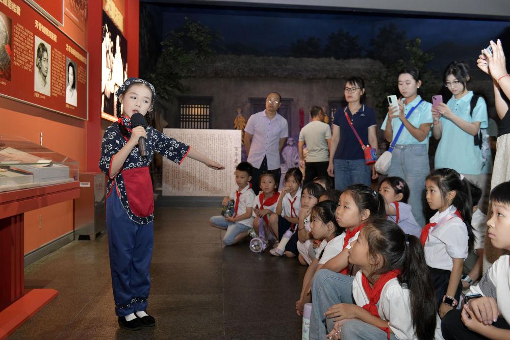 2025年8月7日,在山東沂蒙革命紀念館,臨沂市沂蒙紅孩子文藝先鋒隊的房沫昕在講述紅色故事《沂蒙紅嫂祖秀蓮》。沂蒙紅孩子文藝先鋒隊以“傳承沂蒙精神”為宗旨,通過歌舞、朗誦、故事講述、舞臺劇等紅色主題文藝節(jié)目,以深情表演弘揚主旋律,增強紅色文化感染力,為紅色基因代代相傳注入新生力量。