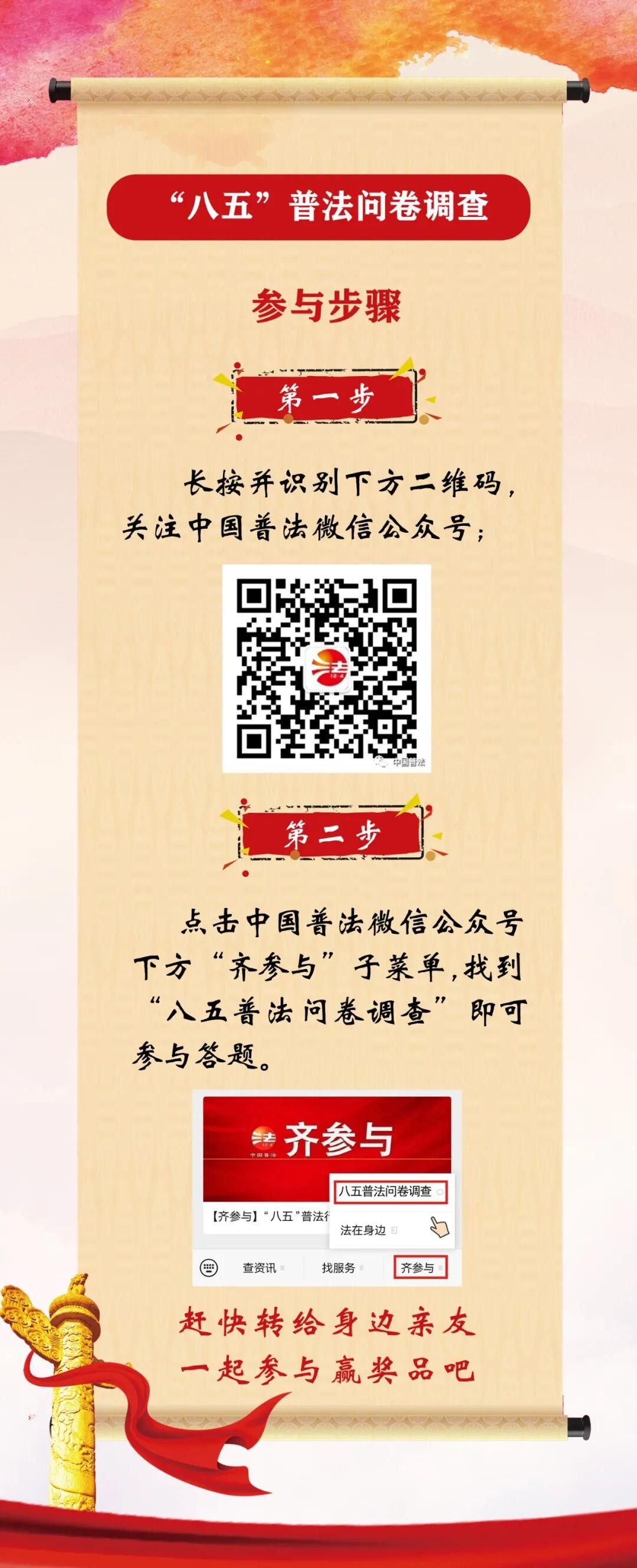 關注“中國普法”微信公眾號,點擊手機下方“齊參與”菜單,找到“八五普法問卷調查”,進入問卷調查頁面即可。