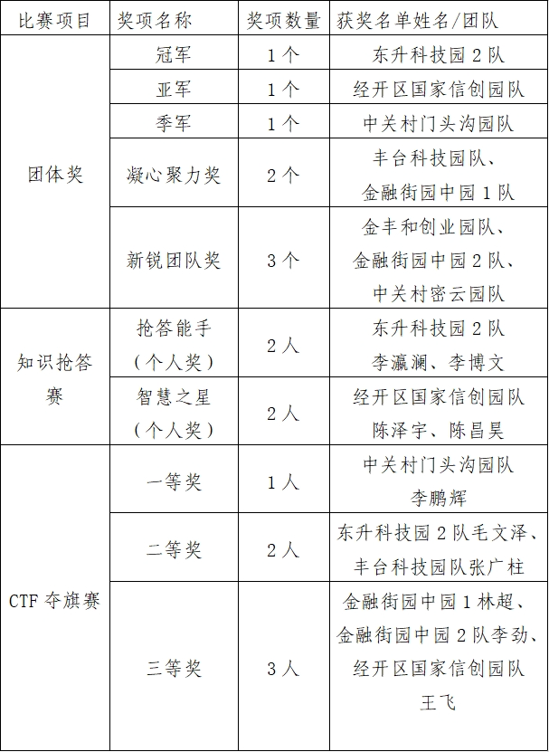 經(jīng)過多輪激烈角逐,最終決出了“智慧之星”“搶答能手”“CTF奪旗賽”個人獎,以及“凝心聚力獎”“新銳團隊獎”和團體冠亞季軍等10余個獎項。比賽結(jié)果公布如下,恭喜這些獲獎隊伍。