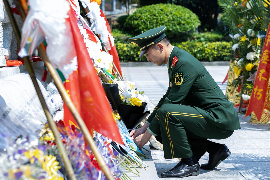 宣誓結(jié)束后,官兵們細(xì)心擦拭每一塊烈士墓碑,清理周邊雜物雜草。隨后,大家依次緩步上前獻(xiàn)花,寄托對(duì)革命先烈的無限哀思與崇高敬意。