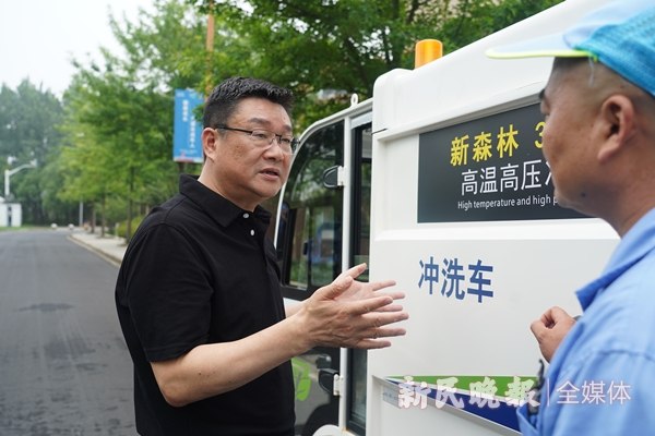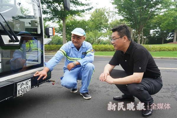 圖說:諸巨明代表(右)實地調研環(huán)衛(wèi)車輛。新民晚報首席記者 劉歆 攝