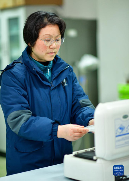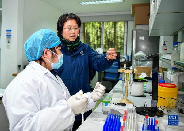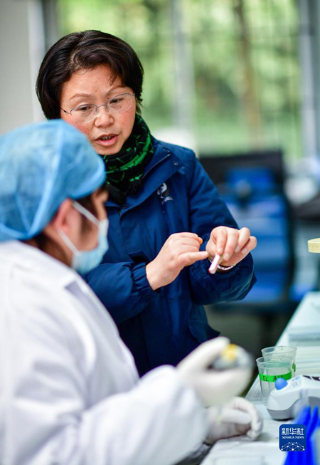 全國人大代表、成都大熊貓繁育研究基地研究中心主任侯蓉在做實驗(2月17日攝)。新華社記者?張超群?攝