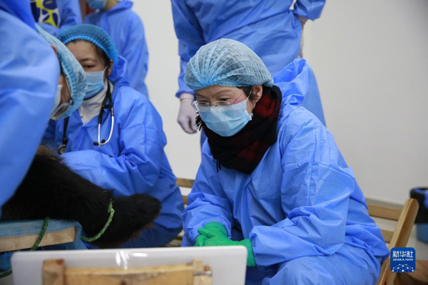 全國人大代表、成都大熊貓繁育研究基地研究中心主任侯蓉(右一)為大熊貓檢查身體(2019年2月1日攝)。新華社發(fā)(成都大熊貓繁育研究基地供圖)
