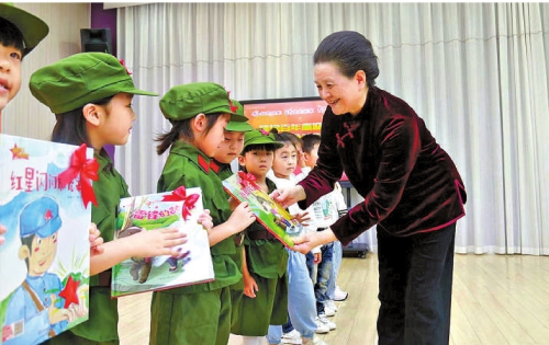 郭建華走進(jìn)開(kāi)封市金明幼兒園,向孩子們贈(zèng)送圖書(shū)。