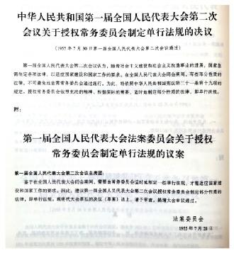 1955年7月30日,根據(jù)法案委員會(huì)的建議,一屆全國人大二次會(huì)議作出決定:“隨著社會(huì)主義建設(shè)和社會(huì)主義改造事業(yè)的進(jìn)展,國家急需制定各項(xiàng)法律,以適應(yīng)國家建設(shè)和國家工作的要求。在全國人民代表大會(huì)閉會(huì)期間,有些部分性質(zhì)的法律,不可避免地急需常務(wù)委員會(huì)通過施行。為此,特依照中華人民共和國憲法第三十一條第十九項(xiàng)的規(guī)定,授權(quán)常務(wù)委員會(huì)依照憲法的精神、根據(jù)實(shí)際的需要,適時(shí)地制定部分性質(zhì)的法律,即單行法規(guī)?!痹摏Q定改變了全國人大是行使國家立法權(quán)唯一機(jī)關(guān)的規(guī)定,是對1954年憲法的重要補(bǔ)充和發(fā)展。