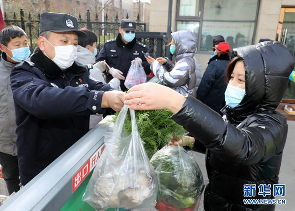 1月10日,在石家莊市橋西區(qū)東風(fēng)北路社區(qū),民警在協(xié)助蔬菜配送員為居民配送蔬菜?!?/span>
