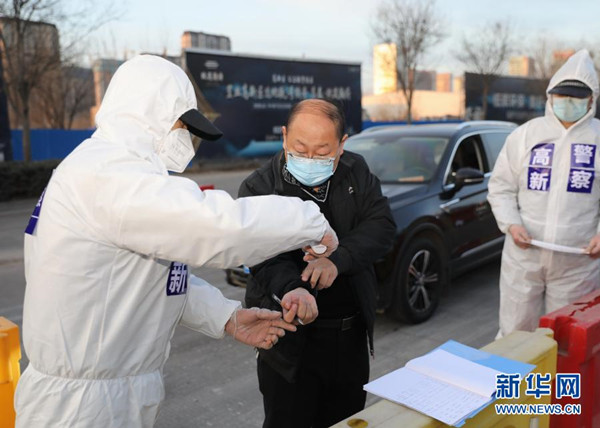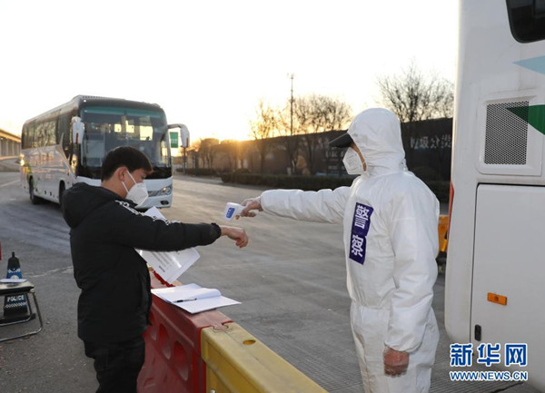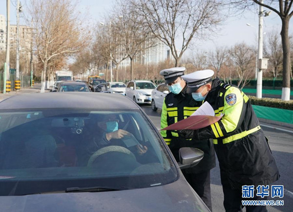 1月10日,石家莊市公安局裕華區(qū)交通警察大隊(duì)民警檢查外出車倆和人員的證件?!?/span>