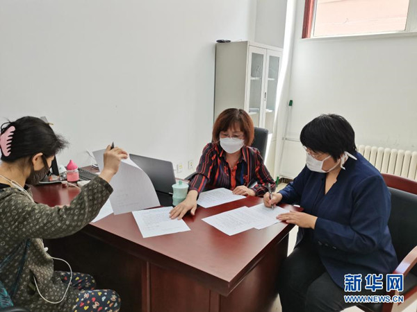 天津市和平區(qū)信訪事項(xiàng)人民調(diào)解委員會(huì)主任王玉珍(中)對雙方當(dāng)事人進(jìn)行調(diào)解(2020年5月13日手機(jī)拍攝)。新華社發(fā)