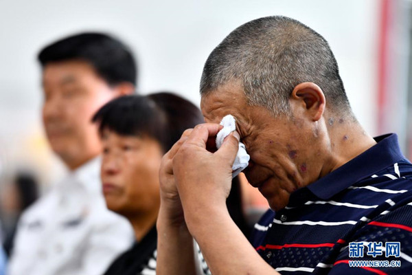 6月8日,在“認(rèn)親,我們在行動(dòng)”濟(jì)南主會(huì)場,吳某林在擦拭眼淚,他即將與被拐多年的兒子相認(rèn)。新華社記者 郭緒雷 攝