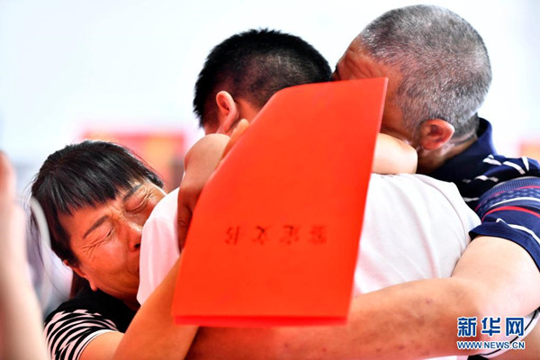 6月8日,在“認(rèn)親,我們在行動(dòng)”濟(jì)南主會(huì)場,張某(左)和吳某林(右)擁抱著被拐的兒子。新華社記者 郭緒雷 攝