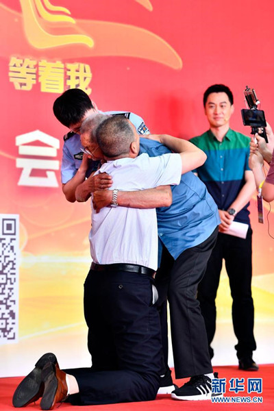 6月8日,在“認(rèn)親,我們在行動(dòng)”濟(jì)南主會(huì)場,被拐58年的羅亞軍跪擁著90歲高齡的父親羅鳳坤。新華社記者 郭緒雷 攝