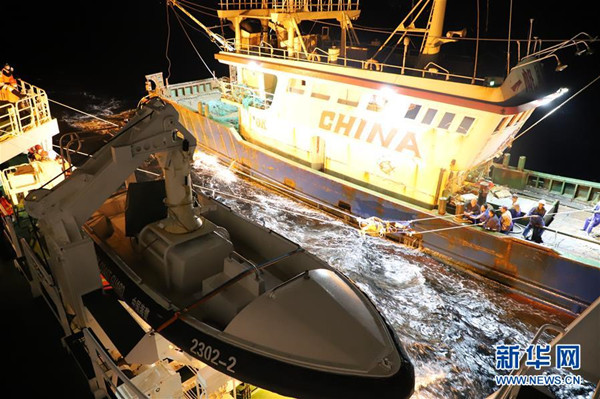 海警執(zhí)法員深夜追緝涉嫌非法運(yùn)砂船舶(2月28日攝)。 新華社發(fā)