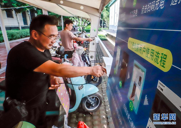 8月1日,業(yè)主在河北省遵化市一住宅小區(qū)電動(dòng)車集中停放處充電。