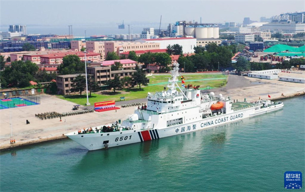 7月18日,中國(guó)海警局“長(zhǎng)山艦”駛離碼頭(視頻截圖)。新華社發(fā)
