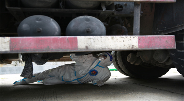 移民管理警察正在檢查通關(guān)車輛駕駛室。(肖富貴 攝)