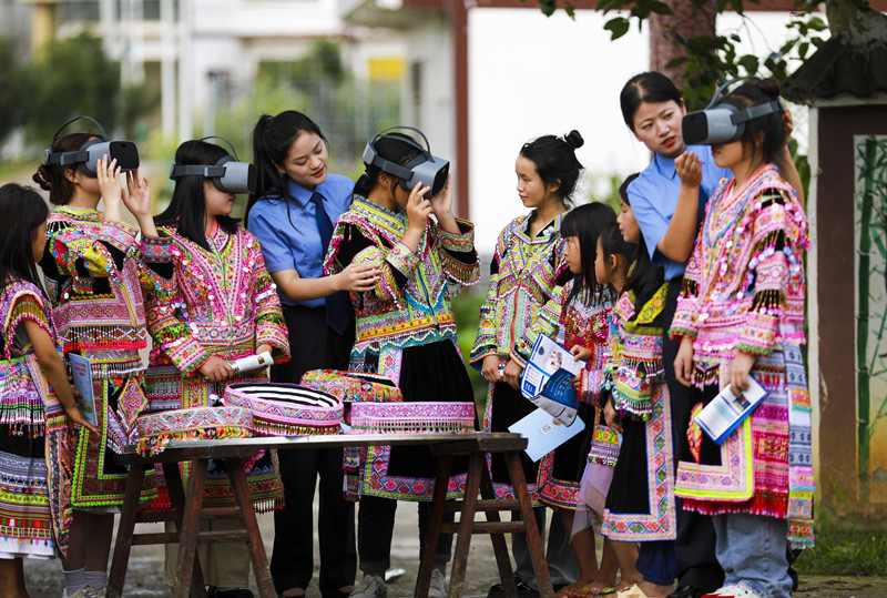 8月2日,貴州省黔西市人民檢察院檢察官來(lái)到協(xié)和鎮(zhèn)楊柳社區(qū)的苗寨里,開(kāi)展“法治宣傳進(jìn)苗寨”宣傳活動(dòng)。圖為檢察官利用VR眼鏡,讓村民體驗(yàn)吸毒對(duì)人體的危害。