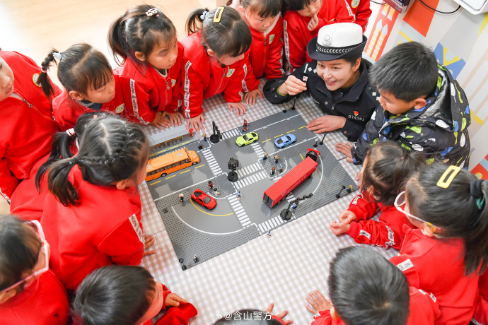 近日,安徽省含山縣公安局交管大隊組織民警走進幼兒園開展以“小手拉大手 安全文明出行”為主題的交通安全宣傳活動,增強幼兒道路交通安全意識。圖為民警通過模擬道具與孩子們互動交流。