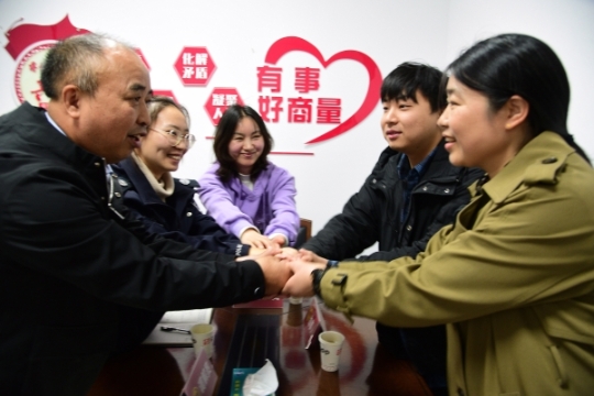 山東棗莊市市中區(qū)司法局龍山路司法所工作人員和人民調(diào)解員調(diào)解糾紛