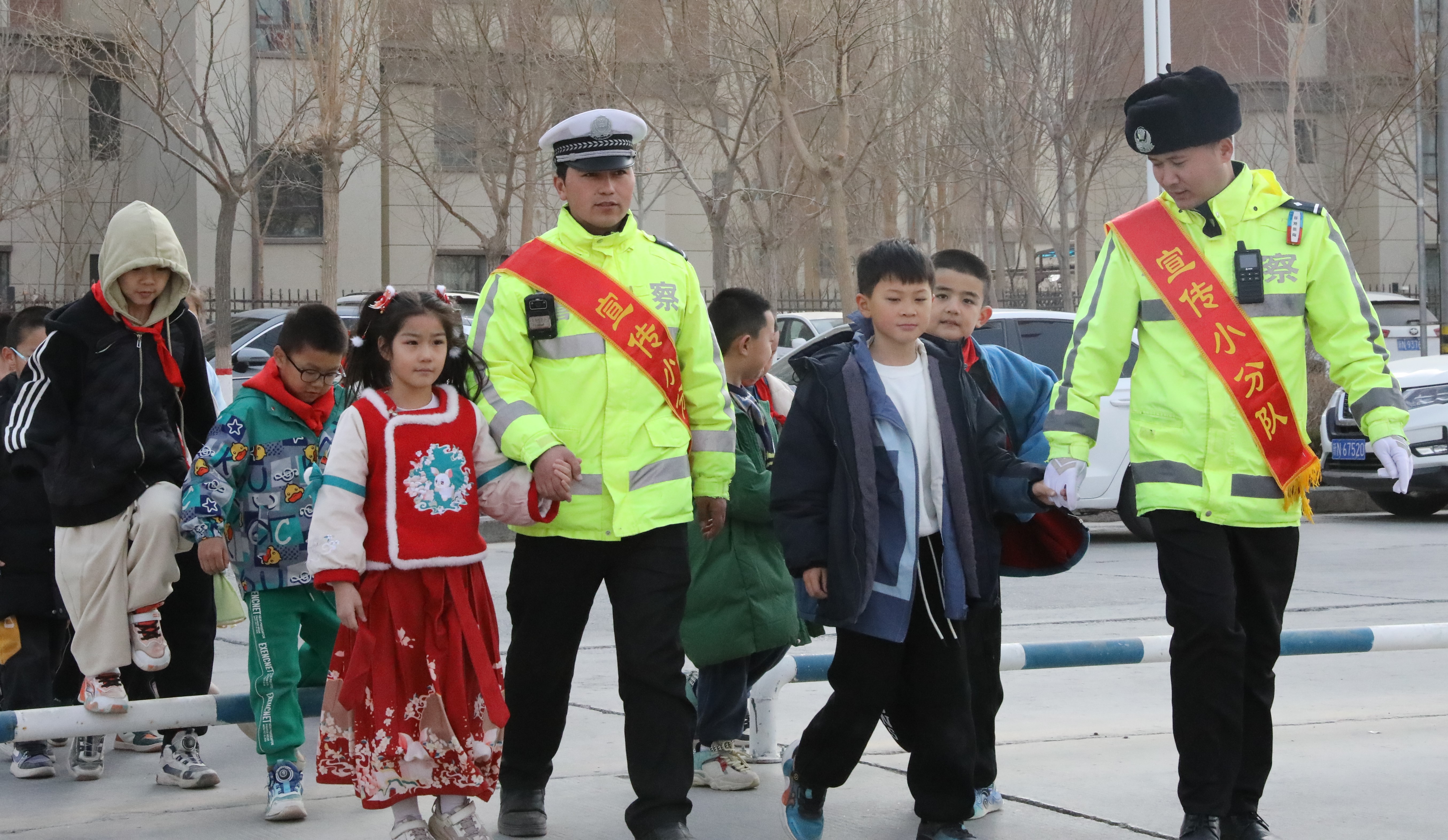 2月25日新學(xué)期的第一天,新疆維吾爾自治區(qū)阿克蘇地區(qū)溫宿縣公安局交通管理大隊(duì)民警走進(jìn)溫宿縣第八中學(xué),開展“開學(xué)第一課”交通安全主題宣傳活動。圖為民警在學(xué)校操場上模擬現(xiàn)實(shí)場景,為學(xué)生們講解如何正確過馬路。