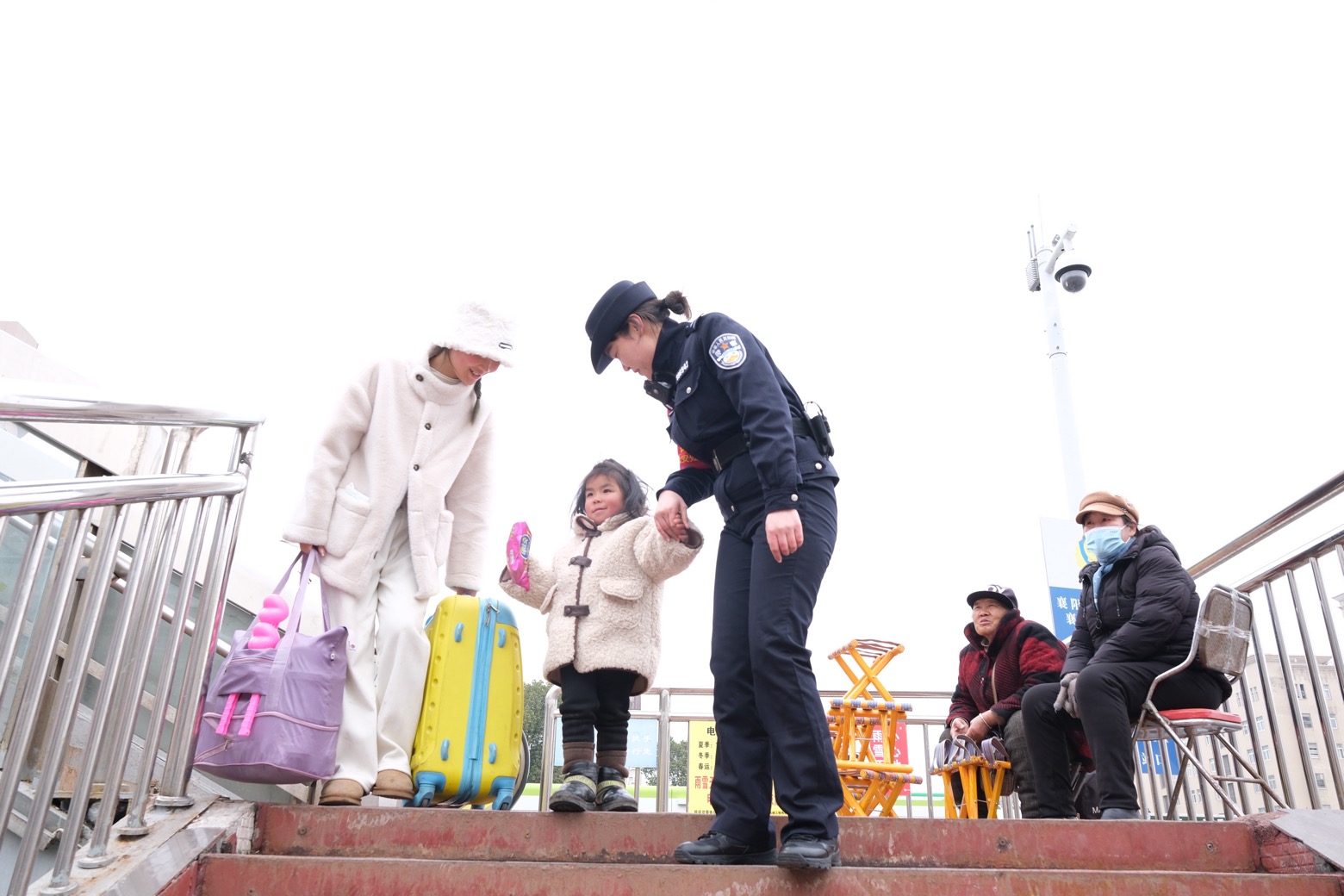 近日,湖北省普降大雪。為確保廣大旅客安全出行,襄陽鐵路公安處乘警支隊與襄陽車站派出所積極做好車站及列車秩序維護(hù)工作,保障旅客生命及財產(chǎn)安全。圖為2月26日,民警幫助一位帶小孩的女士進(jìn)站乘車。