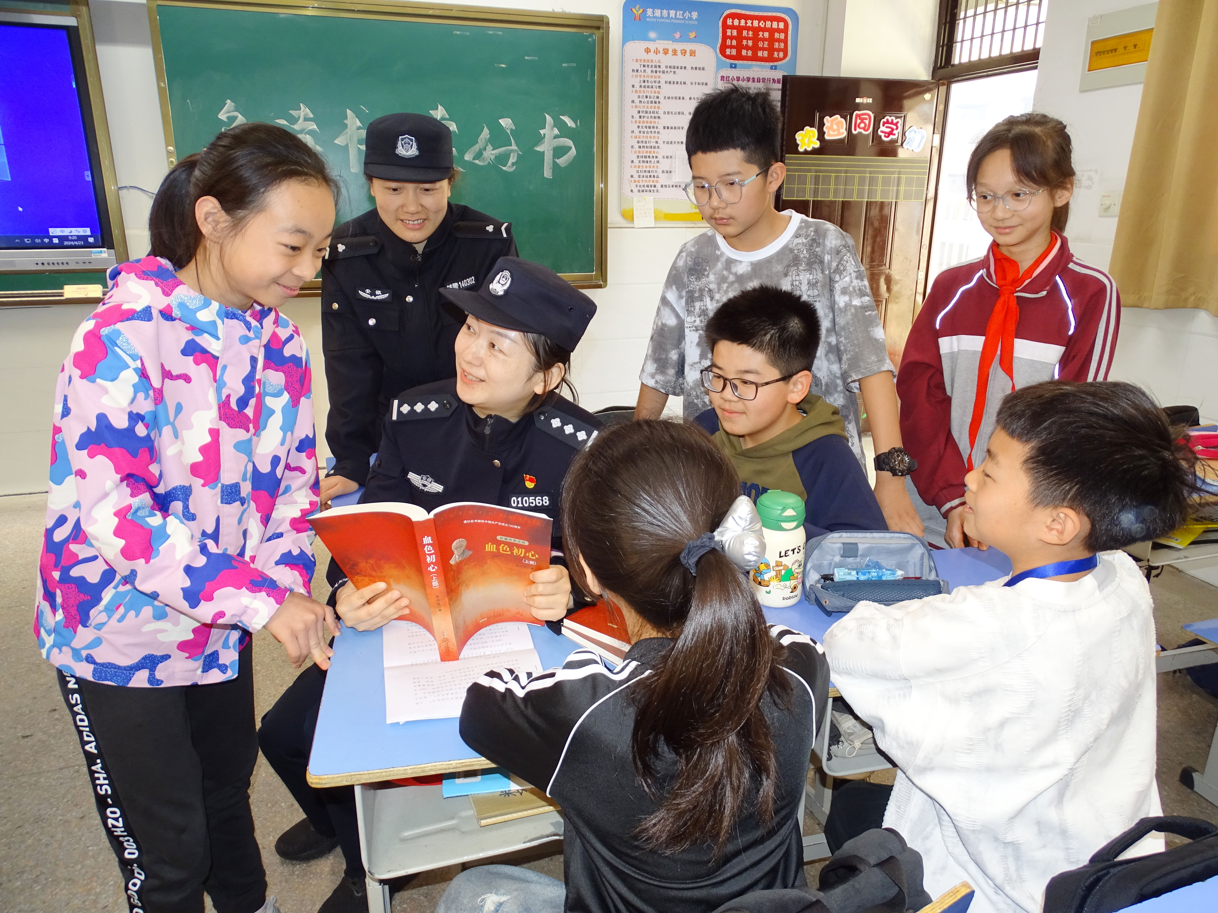 4月23日,安徽省蕪湖市公安局鏡湖分局濱江派出所組織民警來到轄區(qū)育紅小學(xué)開展世界讀書日主題宣傳教育活動(dòng),引導(dǎo)孩子們讀好書、勤讀書,從書中汲取養(yǎng)分。圖為民警與孩子們同讀一本書。
