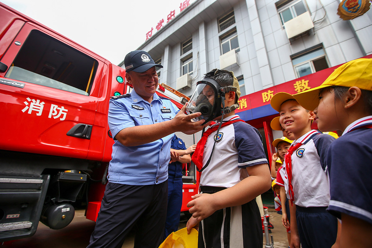 7月16日,山東省濟南市公安局市中分局六里山派出所聯(lián)合玉函北社區(qū),組織玉函小學(xué)學(xué)生走進英雄山路消防救援站開展暑假研學(xué)活動。圖為民警指導(dǎo)學(xué)生體驗消防裝備。