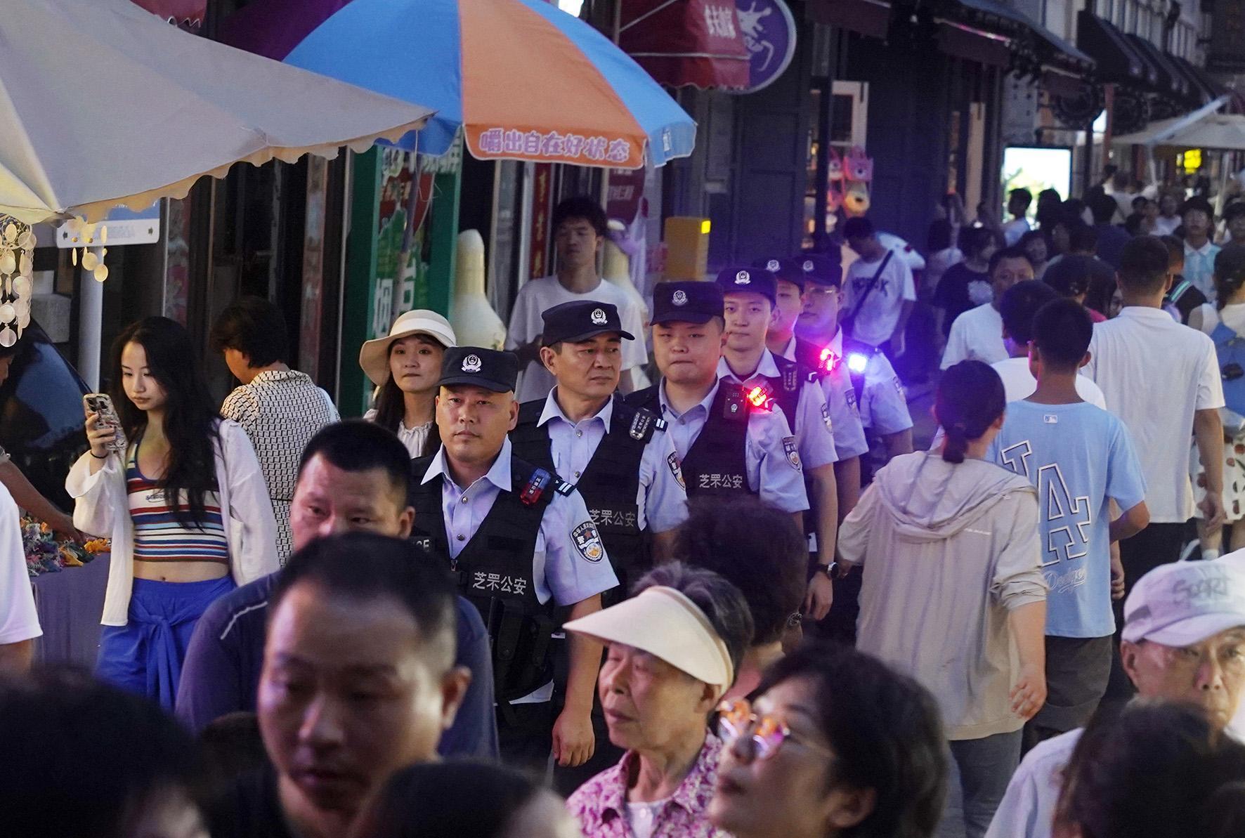 近日,山東省煙臺市公安局開展夏夜治安巡查宣防第二次集中統(tǒng)一行動,組織警力加大對景區(qū)、車站等人員密集區(qū)域的檢查和巡防力度,全力營造安全穩(wěn)定的社會治安環(huán)境。圖為煙臺市公安局芝罘分局民警在朝陽街景區(qū)巡邏。