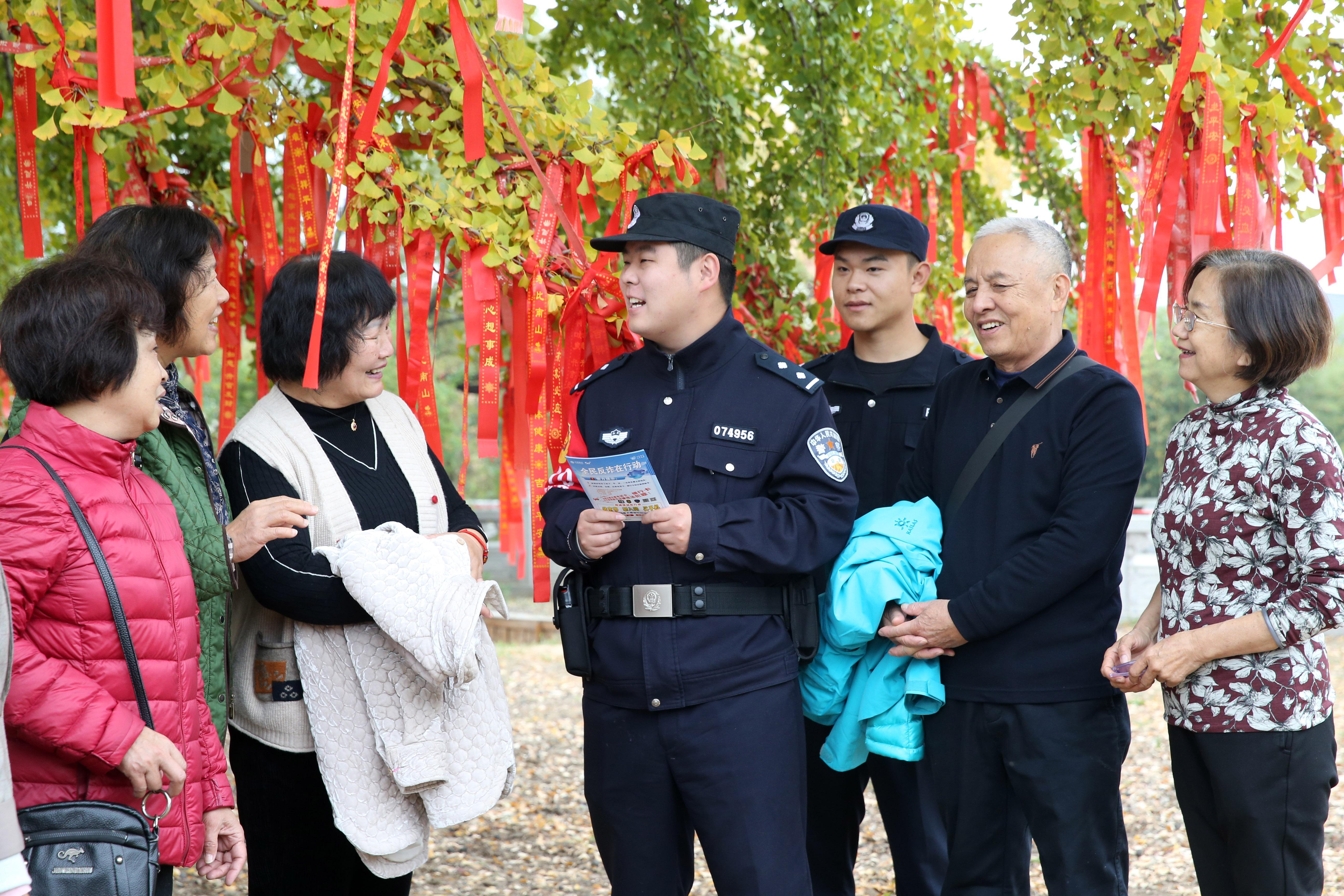 近日,山東省臨沂市郯城縣新村銀杏開(kāi)發(fā)區(qū)內(nèi)的三千年古銀杏樹(shù)進(jìn)入最佳觀賞期,吸引眾多游客前來(lái)打卡。郯城縣公安局新村派出所民警來(lái)到景區(qū)開(kāi)展反詐宣傳活動(dòng),提高游客的防詐意識(shí)。圖為十一月十日,民警向游客普及反詐知識(shí)。