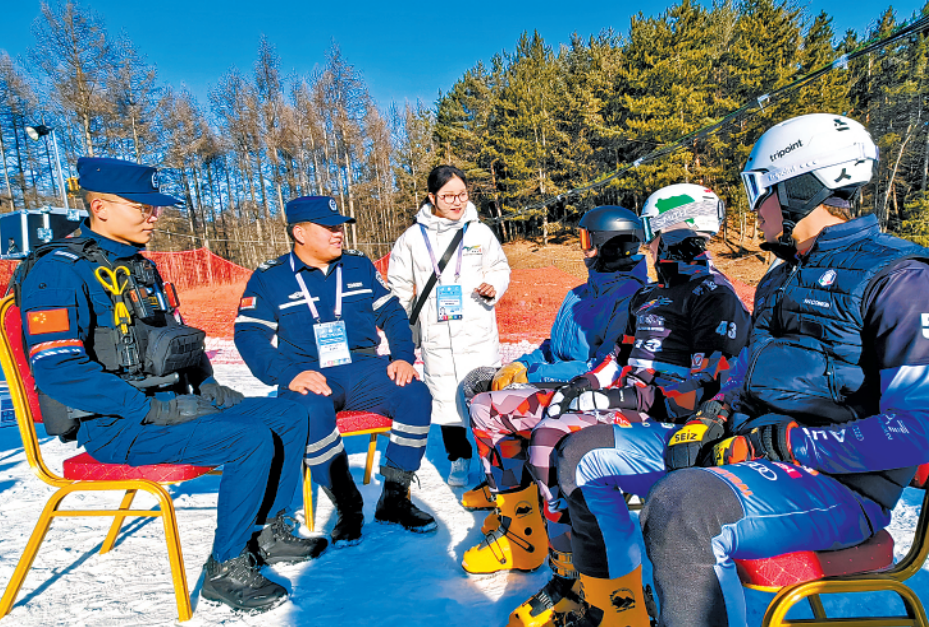 12月1日,2024—2025賽季國際雪聯(lián)單板滑雪平行大回轉世界杯比賽在內蒙古自治區(qū)喀喇沁旗開賽,為確保比賽順利進行,喀喇沁旗公安局全力保障賽場內外安全穩(wěn)定。圖為11月30日,民警在賽場內與參賽運動員“話安全”。