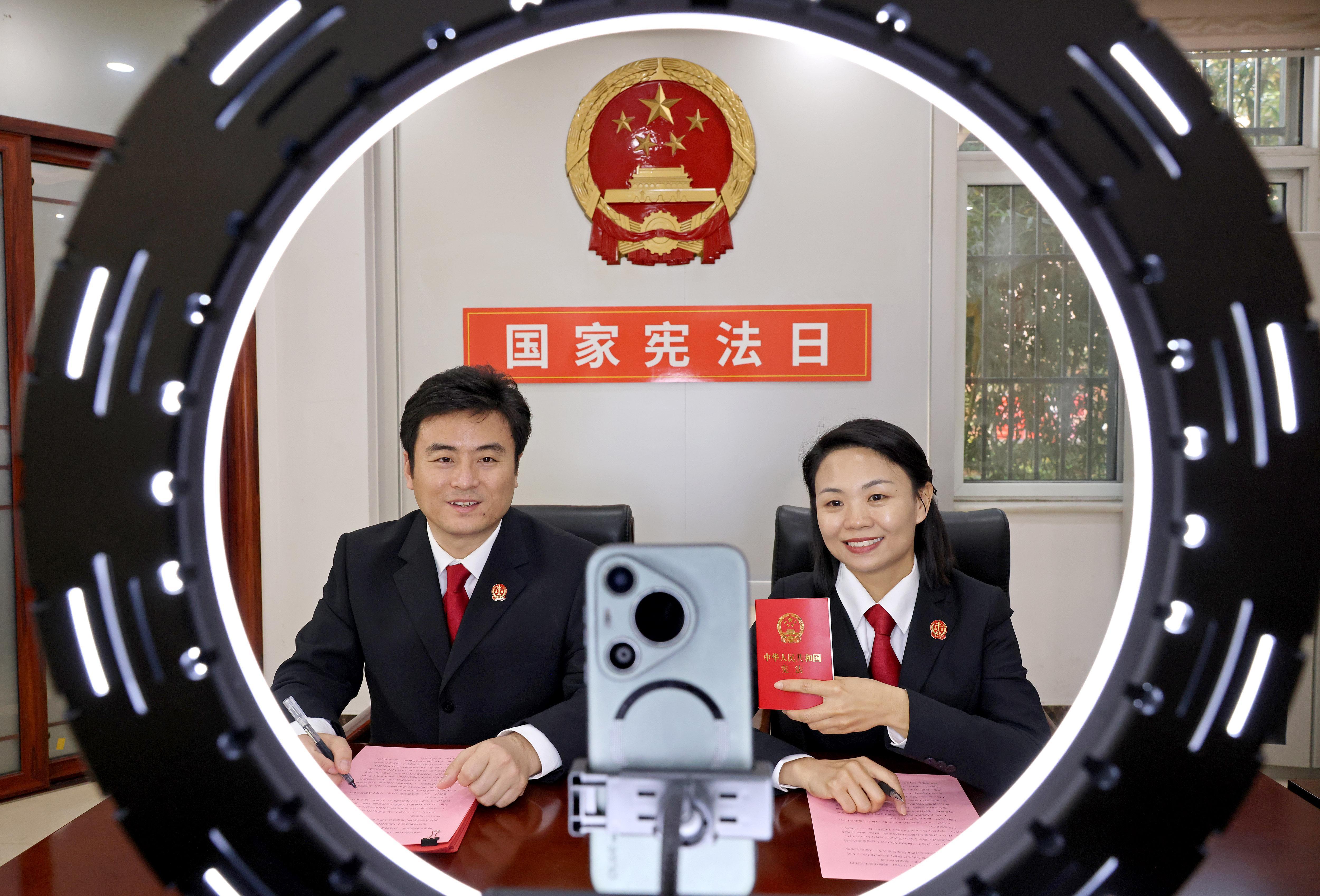 12月3日,山東省棗莊市市中區(qū)人民法院開展“憲法宣傳周”活動,兩名法官通過線上直播方式向觀眾宣傳憲法知識。圖為法官講解國家憲法日的由來。