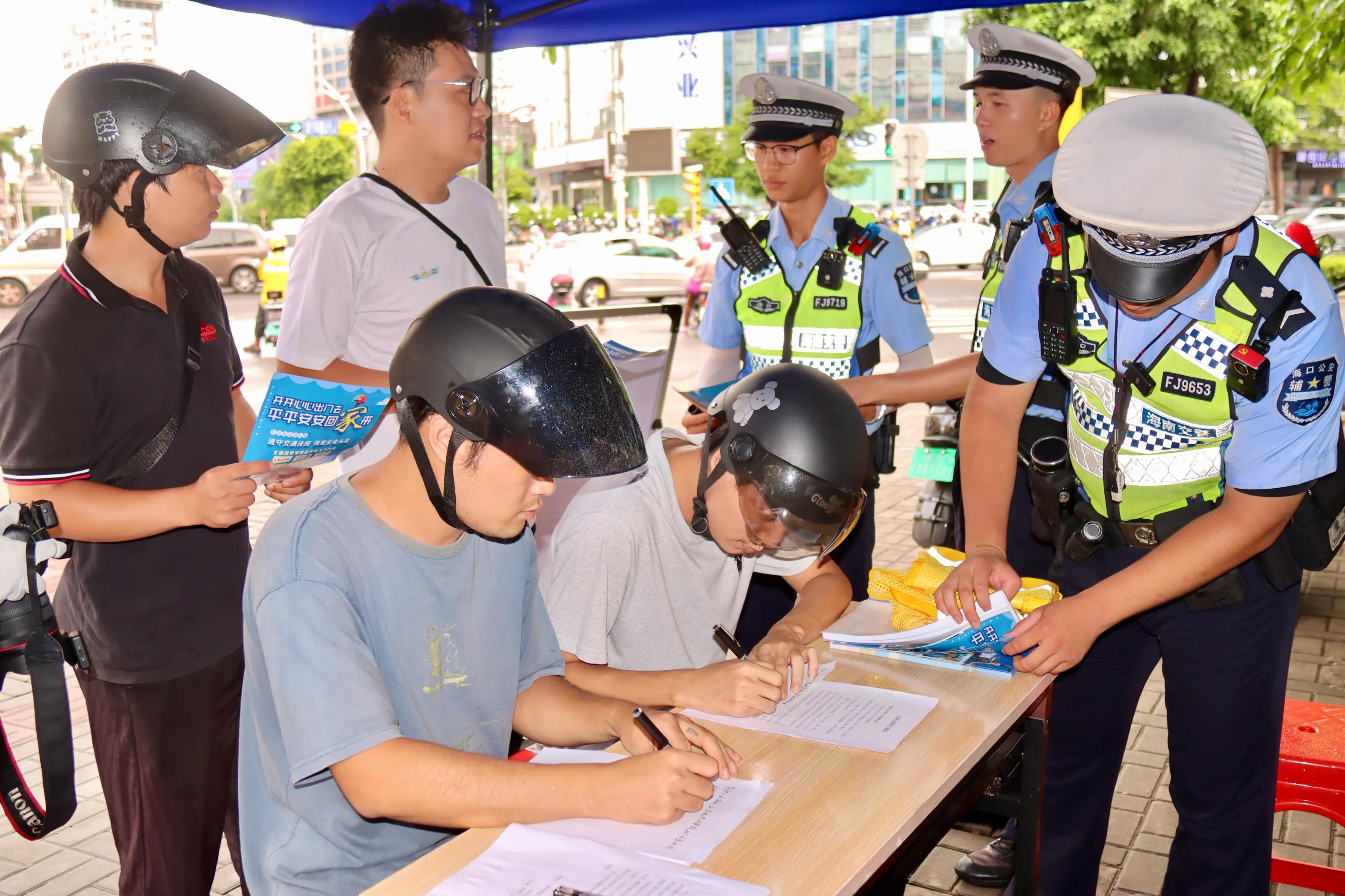 近日,海南??诠步痪谥攸c路段、商圈和學(xué)校周邊針對摩托車、電動自行車交通違法行為加大執(zhí)法力度,對闖紅燈、逆行、未佩戴安全頭盔、無號牌上路行駛等高頻違法行為開展精準整治。在嚴格執(zhí)法的同時,設(shè)立“馬路學(xué)堂”推行“教育免罰”,違法當事人可任選觀看警示教育視頻、抄寫交通法規(guī)條文、體驗輔助執(zhí)法中的一種方式完成學(xué)習,簽署文明騎行承諾書后即可免罰,將執(zhí)法現(xiàn)場變?yōu)槠辗ㄕn堂,讓當事人深刻認識交通安全重要性。