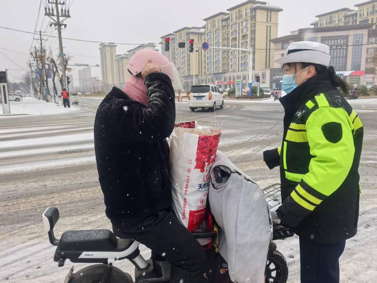 圖為菏澤交警在提醒非機(jī)動(dòng)車駕駛員戴好頭盔。
