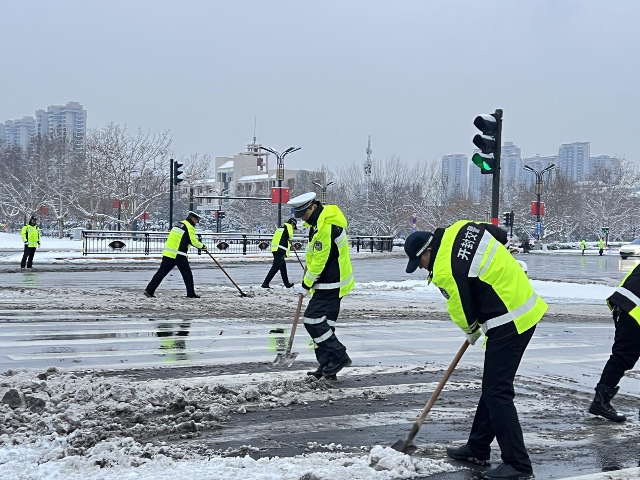 圖為開封交警在道路上清除冰雪。